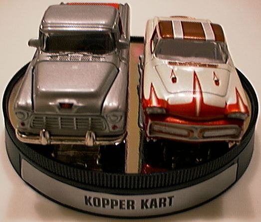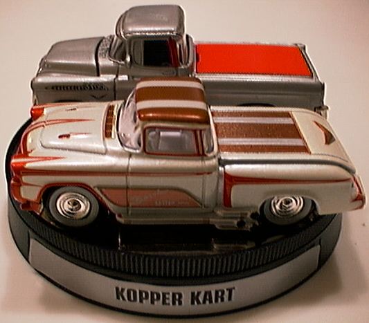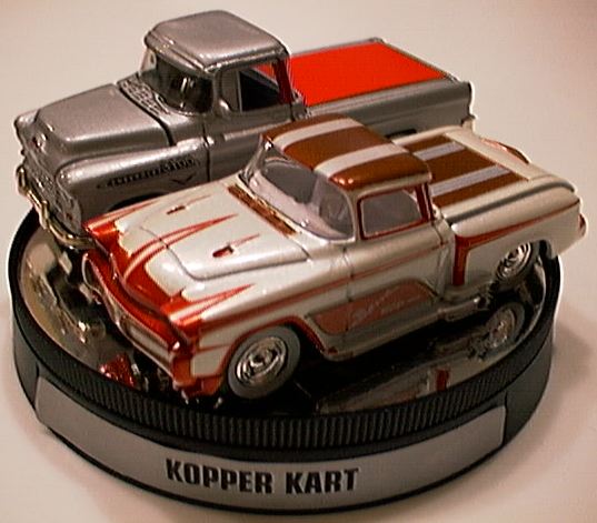 When I saw the new 'Kopper Kart' Barris custom from Johnny Lightning I immediatly had the urge to put it side-by-side with the stock version of the '55 Chevy Cameo offered as part of the JL truck series. I was reminded of the old model kits that allowed you to build a stock or custom version. While the 'Kopper Kart' appears to be based on a Cameo from '57 (I'm not a truck expert), the side-by-side view is still fun. I hope you enjoy the comparison too.
