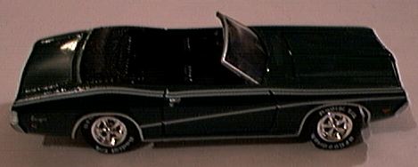 The 1969 Mercury Cougar XR-7 Convertible originally appeared as a James Bond car for Johnny Lightning. This dark green version is very well done. The 1968 Ford Torino Convertible represents the Indy Pace Car of that year. The hard-top Torino was a success at NASCAR. Rubber tires would improve the look of this car and the Dodge Challenger (right). |