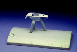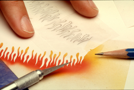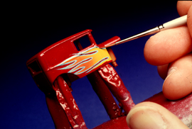 Customizing Your Own Cruisers I have been enjoying the art of customizing 1:64 scale cars for approximately 5 years. My love for little cars began 40 years ago as I held my first matchbox car- a red E-type jaguar. My personal interest centers on hot rods and customs, and vintage grand prix race cars. The very thought of creating my own customs has made the hobby of collecting that much more enjoyable. I will outline the major steps in creating your own cruisers. Portions of this article first appeared in Toy Cars and Vehicles, July 2000, Krause Publications. The car body is removed from its chassis with a dremel burr or drill bit. The body is dunked into paint stripper, suspended by wire. Approximately ten minutes later, the body is removed, carefully rinsed, scrubbed with an old toothbrush and dried. Any paint left in the seams of the car (panels, doors, grill) is picked away with an old x-acto knife. Windows, wheel wells and other openings are smoothed with small jewelers files. Other imperfections are corrected as needed. Steel wool, fine grit sand paper or a dremel steel brush further smooths the car body. Wheel selection is important. The variety of rims and wheels can enhance the attitude and altitude of your hot rod. Donor wheels can come from a variety of sources: Racing Champions, Johnny Lightning and Hot Wheels. Remove the wheels and axles from both the recipient and donor chassis' with either an x-acto blade (plastic chassis) or a side-cutting dremel bit (metal). Place the new set of wheels in place with the stripped metal car body to check the look and fit. Remember to consider the thickness of the paint and clear coat to come. Place the new set of wheels in place and glue in place. If necessary, cut axles to fit and super glue in place. If the wheels are not free wheeling on their axles, make a sleeve from metal or plastic tubing or roll up a small amount of masking tape-sticky side out- and then glue in place. The axles and wheels should slide and roll easily now. The car body is placed on a paint stand made from nails attached to a block of wood. The stand provides a hands-off means for supporting and turning the car while paint is being sprayed. An added extra may include a cheap plastic lazy susan to place under the paint stand which allows controlled turning during the painting process. For best results, the paint can be warmed for a few minutes in a pan with a few inches of hot water (not on the stove!). This thins the paint allowing primer and other coats to go on smoothly. The stand is placed in a well ventilated spray hood. Without starting or stopping on the car body, begin a continuous spray back and forth spraying past the car body, turning it slightly as you go. Spray carefully but lightly into all of the nooks and crannies. Follow the directions on the aerosol can for best results. Allow the car to dry for 48 hours before further painting. For a flamed hot rod, the area of the car to be painted is traced on tracing paper. Sketches of proposed flames or designs are then doodled. The final sketch is placed over the body panel, fenders, or hood -checked for placement. A small piece of frisk film, is cut and placed directly over the sketch. Using a sharp #11 x-acto knife, the flame is carefully cut out. This newly made mask with its opening is carefully positioned on to the area of the car to be airbrushed. For the opposite side of the car, the drawing is flipped over and retraced. Frisk film is reapplied to the sketch and the shape is again cut out. Save the cut out flames- they can be used on other customs. The portions of the body which are not to be painted can be covered and protected with low tack masking tape. Airbrushing proceeds. Solid or fading colors can be applied, whichever matches your creativity. Keep your coats thin and allow them to dry between applications to minimize an edge on the flame. After a few minutes of drying time, the masks are carefully removed. Invariably over-spray from the airbrush will creep under your masks and into crevices. I have found Oops, latex remover works great for clean up. With a small amount of the fluid on a small brush you can wipe away the over-spray and further shape your flames. An alternative is to sharpen the flame edges with the same color used on the body. To add another look to your flames and graphics, add a small pin stripe or outline. The color of the outline can match your car's interior or be a darker or lighter shade of the body color. Apply the color with a small brush carefully pulling the color along the outline. Because this is close-up work, I wear an Optivisor which magnifies the the car by two times. Patience is a virtue, so take your time and enjoy the process. Alternate approaches will give your little hot rod a different look: outline only the top or the bottom of the flame. A light color on top can highlight while a darker color under the flame adds a shadow effect. Use your imagination--its your car with no rules! The flames which were previously cut out of the frisk can be placed onto your cruiser to serve now as the new mask and the flame color. Left: Frisk film was applied, masking the white car body leaving flame openings and purple enamel was airbrushed. Masking was removed and each of the flames was outlined with green with a small brush. Right: Portions of the body and flames were covered in frisk film using a pre-existing cut-out flame and masking tape. The body was airbrushed with red. The masks were removed and the flames were outlined with yellow streaking lines. Both cars dried for 2 days, were clearcoated and then reassembled. Here's a short cut to the painting process- find the car you like already factory painted and remove the "tampos" or designs. First, take the car apart. Apply fingernail polish remover, brake fluid or Oops with a Q-tip. Keep the fluid away from plastic windshields. Once the designs are removed-your creativity begins. The cruising canvas is now yours to pai