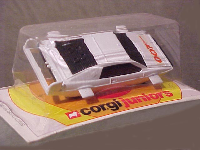He presses a button and a section of the ceiling lowers to reveal a BMW Z8. A man in a white coat is loading a missile into one of the headlamps. He then steps off the platform. 'Q' gestures to him and introduces, "007, my Deputy Assistant. I'm grooming him to follow me." 007 quips to Man, "That would make you...'R'"? "Ahhh, the rampant 007 wit. I, of course, am laughing inside. But I dare say you've met your match in this machine." Guiding a tour of the car, 'R' continues, "The absolute latest in intercepts, surveillance and countermeasures. Titanium plating and armor, a multi-tasking heads-up display. Completely indestructible. All in all, rather stocked." "'Fully loaded' I think is the term." 'Q' adds as 'R' pats the fender. "He's pretty damned fond of his machine." 'R' beseeches Bond, "Do take good care of her." That's our introduction to the beautiful BMW Z8, seen throughout the movie "The World Is Not Enough," 1999, starring Pierce Brosnan and Sophie Marceau. Without a doubt, the James Bond sequence of movies offers the most enthralling array of automobiles in the history of film. This month's story is the second in a compilation of five articles addressing vehicles replicated in 1/64 scale diecast and inspired by American movies and television. I have grouped the James Bond movies together and all replicas alphabetically by show title. If, in the past, Corgi and Ertl produced the best variety of diecast cars from the silver screen, then Johnny Lightning (JL) must be lauded for its present dedication to vehicles of this type. In 1998, JL released the first issue of its 'JAMES BOND 007' series. Eight new castings represented ten 007 movies and each blister pack sported one of five different bonus photo cards for that movie. Most replicas were reasonably accurate and finely crafted considering the retail price of about $3 each. All the JL releases mentioned here can come with a surprise substitute casting, or 'White Lightnings,' in the regular blister card. 'White Lightnings' differ from the regular casting only in that they enhanced with special tires bearing that name in white letters and sport white bases or other 'white' peculiarities. Who could forget the miraculous escape performed by a powerful red fastback as it careened through a Las Vegas alleyway on two wheels? JL copied that stunt-performing 1971 Ford Mustang, from "Diamonds Are Forever," 1971, starring Sean Connery and Jill St. John. Of course, the chasers did not make the squeeze and Bond got away. In the same series, JL must have replicated the diminutive Sunbeam Alpine convertible from "Dr. No," 1962, with Sean Connery and Ursula Andress, because it was involved in 007's first ever car chase, a pursuit in which the trailing car burst into flames at the bottom of a ravine. If Connery was most associated with the Aston Martin, then Roger Moore's trademark vehicle would be the British-made Lotus Esprit. For all practical purposes, there are two distinct body styles of the Lotus Esprit. Italian design studio Giugiaro created the doorstop or 'wedge' version typical from 1976 to 1980 and the Lotus Turbo Esprit (1981-1987) in which the crisp edges of the wedge were softened greatly. Then, for 1988, designer Peter Stevens (of McLaren F1 fame) modernized the entire design inside and out (though it still looked a lot like the Turbo - are you confused?) and that exists pretty much unchanged today. In the beginning of "For Your Eyes Only," 1981, a white Lotus is blown up by its own overzealous anti-theft device. That white car represents the Lotus Esprit wedge from "The Spy Who Loved Me," 1977, and leads us to the newer, though still Giugiaro, copper red Turbo seen throughout "For Your Eyes Only." JL's casting has many details (less ground effects, swooping metal crease above front bumper, hood indentation, etc. - you still confused?) more like that of the Stevens Esprit. But let's give JL credit and say their casting is of the Turbo. Then, JL erroneously used that same casting for the white 'wedge' in the 1977 movie. Equipped with a twin turbo-charged 4 cylinder motor capable of generating 360 horsepower, the actual Lotus Esprit vehicle in "The Spy Who Loved Me," 1977, could reach 165 miles per hour - on land. Its most prized ability, however, was converting into a submarine. Using the submersible function, one could travel at around 22 knots and command a full-screen radar, a periscope, an underwater rear smoke releaser, a harpoon gun, and a vertically launched surface-to-air missile! Again, in its first James Bond series, JL used one casting to represent two cars: the original Aston Martin DB5 from "Thunderball," 1965, and the silver DB5 outfitted with a fax machine and champagne holder from "Goldeneye," 1995. JL should have placed better wheels on both replicas but the casting is passable. In "GoldenEye," starring Pierce Brosnan and Izabella Scorupco, we see the first famous Bond car from "Goldfinger" and "Thunderball" back in action with a new modification: high powered rear-firing water jets. The chase, however, is actually a race in which 007 in the Aston Martin battles against Xenia in a Ferrari (a 355 if I recall correctly). As in "Goldfinger" and "Thunderball" before, the DB5 triumphs as the superior vehicle in all races. Husky (Corgi) had an existing casting of the Aston Martin DB6 - not of 007 lore - which it fitted with an operating ejector seat (and a little man to be ejected) much like the full-sized 007 version and marketed as Bond's. In addition to the ejector seat, the original DB5 first appearing in "Goldfinger" as the magnificent 'Q' masterpiece had retractable .30 caliber Browning machine guns, bullet-proof shield, tire slashers, rotating license plates, smoke screen, oil slick, control console and other devices very difficult to incorporate in 1/64 size! The Husky label was renamed Corgi Juniors in 1969. Eventually, its DB6 (though still inaccurate for 007) received a plastic, instead of metal, base and spor
