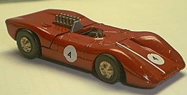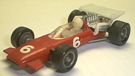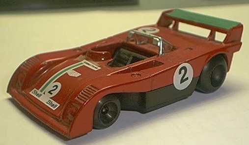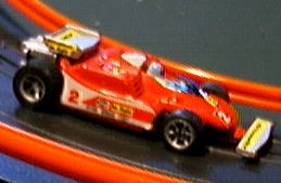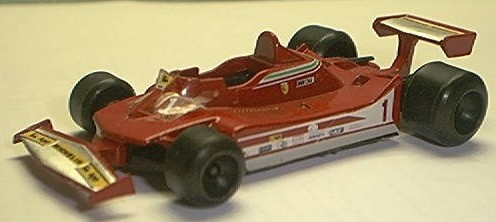 a bit conspicuous in bright blue plastic. Our final diecast picture is the Polistil version of a T4, almost the end of the line for this species of Ferrari. Enzo Ferrari himself called this "the ugliest race car I ever built" but it's purposeful looks brought the factory the last driver's championship (1979 for Jody Scheckter) they would see for over 20 years. Below is a slot-car version of the T4. The 312 engine was abandoned after 1980 but had run up a most impressive record: 4 constructors and 3 drivers championships in a decade. The Ferrari 312 established a great record for a team that manufactures