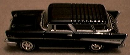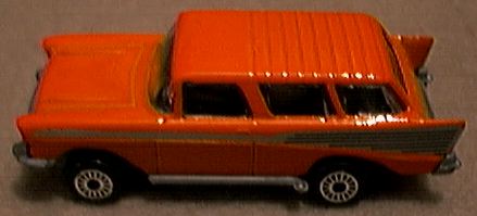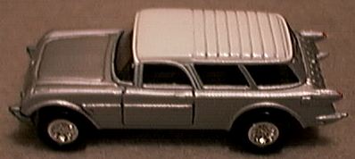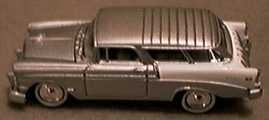 The year was 1954 and was the first time a Chevrolet Nomad was introduced to the public. It was one of the experimental cars in the General Motors Motorama styling show that toured the country. This showcar was actually a modified Corvette body that had been introduced the previous year . The front portion had been joined to the rear end of a very stylish and sporty 2 door station wagon body. the public gave a most favorable reaction. This was an encouragement to GM management since the production Nomad was already slated for production the next year. Johnny Lightning produced a model of this concept vehicle in their Classic Customs Corvette set in 1996. The production car, introduced in the 1955 model year was a top of the line specialty 2-door wagon in the Bel Air series. There were major styling differences between the Nomad and other available Chevrolet station wagons in the 1955 line. The tailgate contained 7 vertical chrome strips. The car was only available as a 2 door model and the side doorposts slanted forward on almost a 45 degree angle. The rear wheels were fully exposed to give the car a sporty appearance. Pontiac also introduced a sporty station wagon model about the same time. This was the Safari and it too possessed the basic design characteristics of the Nomad. Unfortunately this car has not been reproduced in 1/64 scale to date. Hopefully one will appear in the future as model and toy companies search for new cars to produce. The Nomad and Safari wagons were only produced during the 3 year period of 1955-1957. Each car had design changes representative of the styling innovations for those production years. Although the 1958 top of the line Chevrolet wagon was still identified as a Nomad, the design had been modified, allowing this vehicle to be presented as a 4 door 6 passenger automobile. The Nomad model nomenclature remained in the Impala line through 1961. However, the above styling characteristics that differentiated this car from the remainder of the Chevrolet line disappeared. Later Nomads were only Impala, top-of-the-line wagons, and not the sport-specialty cars introduced in the mid-50's. The most recent 1/64 models of the original Nomad were introduced almost simultaneously by Playing Mantis and Hot Wheels. Since the beginning of 2001, Johnny Lightning has issued a model for each of the 3 years of production in their Tri-Chevy series. Hot Wheels also recently issued a dual set of 57 Nomads in their more expensive Collectibles line. These 5 models contribute to almost 50% of all Nomad models ever issued. For clarity, I will review each model in chronological order, 1955-1957 and then alphabetically by the toy/ model manufacturer. 1955 Models Ertl introduced a 1955 Nomad in solid dark blue with opening side doors in 1982 as model # 1914. Also # 1632 apparently had been previously assigned to this casting as well. This casting is no longer available from the manufacturer. Hot Wheels first produced their Classic Nomad in 1970 as model # 6404. It had a sunroof, opening hood and incorrect appearance of what seems to be vertical dual headlamps. Although the lower lenses may possibly be oversized parking lenses. This model was part of the 'Red Line' series. Later issues of this casting were modified to permanently enclose the engine compartment and were given new designations. These included the Alive 55 # 6968 in 1973, and another Classic Nomad # 5743 in 1993. It was not until Hot Wheels reissued the Nomad in 1994 as part of their 25th Anniversary and subsequent Vintage series that the engine compartments were again made visible by providing a separate hinged cover. In 1991 Hot Wheels also modified the front grill portion to correctly portray the correct single headlights on model # 2098. This model has the headlights as part of the body casting, whereas the earlier models had the headlights in chrome and were part of the silver base. This model also shows the correct checkerboard grill design, whereas the earlier castings had this area blacked out. The Johnny Lightning Tri-Chevy model in series 1 is a 2 tone white over light blue. It has the open engine hood feature. 1956 Models Johnny Lightning in their Tri- Chevy series 1 issued a silver/ gray model. Racing Champions issued model # 129 in their Mint Edition set in 1997. It is 2 tone white over red and also has the hood opening feature. Although it is slightly larger then the other models in this review, the detail for such a small model is remarkable. Also issued by Racing Champions in their less expensive Street Wheels Dynamite series is a slightly smaller casting of a hot rod Nomad. Correct detail is missing. The side chrome strip is incorrect. A large blower box protrudes out of the closed engine compartment. This casting is about 3/4 inch less in length then #129. The most correctly detailed item on this latter piece is the 1956 grill. A curious variation on this casting also appeared with an air scoop on the hood and the words 'Fire Chief' on the sides. 1957 Models Johnny Lightning in their Tri- Chevy series 1 issued a black model. As noted above, Hot Wheels recently issued a set of 57 nomads in the Collectible sets series. This set includes a stock model in realistic detail . It is painted 2 tone white over bluish green. It is by far the most realistic and accurate model of all the 1957 productions. The hood opens and reveals a detailed chrome power plant. The companion piece in this set is a customized wagon painted a bright maroon . It has been modified into a dragster. The engine has been placed in the rear compartment of the car and the model flips open from the rear to portray the entire interior of the car. The characteristic side posts have been moved slightly towards the rear portion of the car and both the hood and tailgate have been shaved with all chrome removed, which was characteristic of customizing in that decade. Matchbox issued a crudely designed model in their short-lived Connectable series 