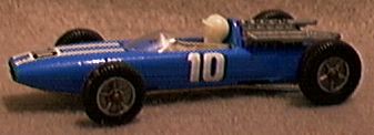 Success at the amateur level brought Hill to the attention of Luigi Chinetti, the Ferrari importer who acted as Enzo Ferrari's eyes and ears in North America. Several early "one-off" drives in Ferrari sports cars for private owners proved that Hill had the right stuff to handle a full time factory job. So in 1956, in his early 20's, Hill found himself in Europe on a Ferrari team led by the great Juan Manuel Fangio, with a host of other experienced hands to learn from. But in those days, the sad fact was that few men grew old and retired from the sport; they usually wound up dead or too seriously injured to continue. Hill steadily worked his way up the bench to the better rides and big-time wins in sports cars. Many of Hill's greatest victories came at the wheel of the famous 250 "Testa Rossa", so named for the red metal cam covers visible under the hood. In 1958, the 250TR carried Hill to wins in the Buenos Aires 1000KM, the 12 hours of Sebring, and the 24 Hours of LeMans; in 1959, Sebring again and a Can-Am race at Riverside, CA. The 250TR had a long, productive life for a race car and continued to perform for Hill; in 1960 he won at Buenos Aires again, and in 1961, Sebring and LeMans for the second time. The very nice example pictured here is a recent release by Hot Wheels. But Ferrari management had Hill marked as a sports-car driver only and kept him waiting for an open wheel drive. Hill had to almost force himself into the Formula 1 lineup but by 1961, he was one of the top drivers on the team. For that season, the engine formula had changed and Ferrari was ready. The weapon was the shark nosed 156 F1, pictured here by Matchbox who made thousands of them. They are still available in various conditions but not many are as nice as the one proudly displayed here by Doug. I understand that Hot Wheels will release a version of this famous race car soon. Ferrari could field 4 or 5 of these cars in each race so except for a couple of all-time drives by Brit Stirling Moss, the "prancing horse" won almost every F1 race they entered. Hill and Wolfgang von Trips were neck and neck for the championship until the Italian GP at Monza where von Trips crashed and sadly died. Hill won and took the crown with what surely must have been mixed feelings. But by 1962, Ferrari success in F1 was gone like a puff of smoke. The Brits with their new Coventry-Climax engines took all the gold. Sports car victories continued however, and Hill took his third LeMans driving a special Testa Rossa with a 4-liter engine. By this time however, the competitive atmosphere at Ferrari had become too much for Hill. His "thinking man's" style of driving was just not flashy enough for Mr. Ferrari. Hill's method was to take it easy during the first half of the race, then pour it on at the end to win, if possible. A mass exodus of personnel at the end of '62 included Hill. "I wasn't sorry to leave; Enzo Ferrari never understood me. I wasn't his type, not super gung-ho enough to suit him. A lot of fine drivers died racing for him and he always favored the man who would take the extra risk in a live-or-die situation. I won a lot of races for him- which is why he kept me around- but I never was his kind of driver. I wasn't willing to die for Enzo Ferrari. I wasn't willing to become one of his sacrifices."