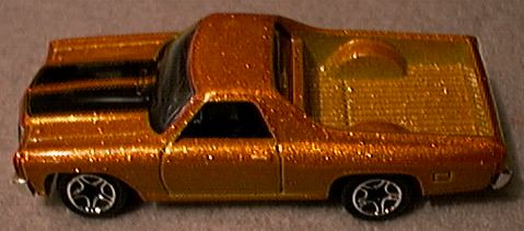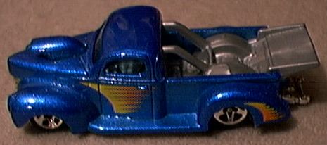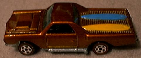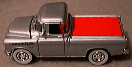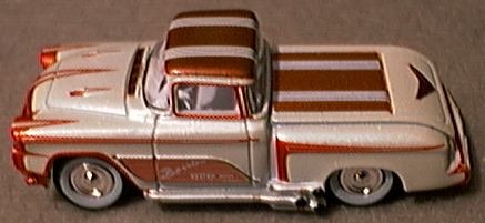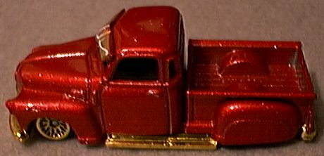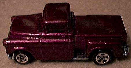 | HOT WHEELS (HW) is one of the most prolific producers of p/ups. In 1974 HW issued a highly customized off road 56 Ford model # 8258 called the Baja Bruiser. I chose to include this model because the grille and some of the body are original. In 1977 HW followed up with a realistic version of the 56 Ford called the Hi- Tailer # 9647. This model was first issued with 2 motorcycles in the rear bed. Later editions sported a cap over the bed. In 1998 a model of the 1940 Ford was issued in the First Edition series and was presented as a drag vehicle. In 1972 the 1956 Chevy Flashsider # 2029 was issued. No interior is visible. A highly detailed 1959 Chevy Apache was part of the Collectibles Smoke n' Water set in 2000. Also in the same year HW issued 2 Chevy El Caminos. The 1968 model was a First Edition and had a large and unsightly engine protruding out of the p/up boxed area. Also it had a large racing wing attached at the rear bumper area. The second p/up was a 1970 detailed model in the enhanced Collectibles Popular Hot Rodding set. In 2001, HW recently issued La Troca as First Edition #15. It appears to be a slightly modified 53 Chevy. | ![]() 'Flashsider'1956 Chevrolet |