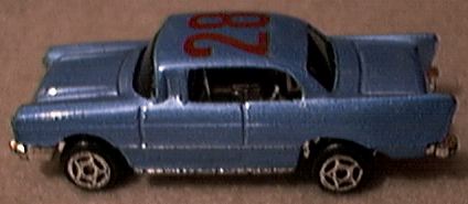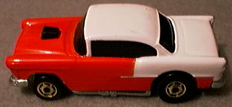 Kenner produced a 55 two door coupe in their Fast 111s series about 1980 and called the car the 'Shiftin Chevy' It featured an enlarged real bumper that was designed to hold a specially issued collectible license plate. There was also a blower that extended out of the engine hood.