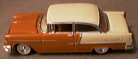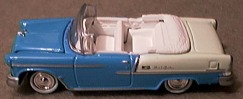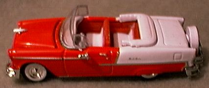 A few months ago I reviewed the Nomad Wagons ( TofTC May 01) that were peculiar to the above production dates . This additional analysis will attempt to inventory and summarize the other toy cars that represent vehicles manufactured during this special 3 year period . I recall that time vividly as I was only a year shy of getting my drivers license when the new 55 Chevys made their first appearance in our local dealer's showroom. The styling was a radical change from the bulbous, rounded appearance of the previous year! Wraparound windshields were introduced . The chicken wire rectangular grille replaced a large toothed bar from 54. The car was lower to the ground and although the the styling was more angular, it gave the appearance of being more streamlined! These cars were very pleasing to the eyes of the possible consumers and attracted many interested parties including me. Changes in the styling for 1956 were moderate. A new chrome strip design on the side panels was used to offset the two tone paint schemes to a greater advantage. The front grille was lengthened and modified to extend the full length of and above the front bumper . The final year of the Tri Chevys also provided some noticeable styling changes. The body angles were more rounded . The rear fender fins were more pronounced . The front grille was rounded at the corners and had a more prominent bumper design. The hood had 2 inset bullets over the engine compartment. Again the side chrome moldings were changed. The side strip swept to the rear fender where it joined a large anodized aluminum panel . I recall a teenage buddy bought one of these red convertibles with a white vinyl top. He added rear fender skirts which made this beauty a 'lady catcher' for him! Oh, to be able to reclaim this car now. But we can't, so the next best thing is to replicate it in small scale - many times over. Most toy / model manufacturers have produced at least one model in 1/64 or approximate scale of these cars. However at least 2 prominent foreign companies to the best of my knowledge have not as yet provided any models in this area, Siku of Germany and Tomica of Japan. Recently both Playing Mantis and Mattel capitalized on this marketing scheme with their Tri- Chevy sets as noted below. I will summarize each model/ toy manufacturer (known to me) in alphabetical order and discuss which if not all 3 years were offered by each producer in miniature. Coincidentally, after I received this assignment, members of the on line board mboxcommunity.com which is part of www.charliemackonline.com provided a listing of Tri- Chevy models a few months ago, most of which I had already listed on my inventory. However, I did learn about a few more companies which are included below.