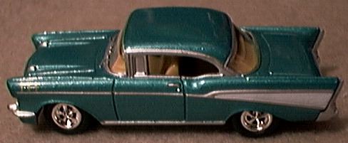 Majorette produces a 57 HT #223 and refers to it as the Chevy Hot Rod. There is a blower extending from the engine hood. Matchbox (MB) produced the 57 Bel Air HT # 4D/ 43H6 in 1979. The hood incorrectly opened forward from the firewall. A new casting (tool) was introduced in 97 that corrected this problem. Models of the 55 Convertible (top down) #46 and HT #73 were available in the 1-100 Collection in 1999. In addition a 57 Convertible #47 was issued in 1998. Also MB Collectibles Motor Trend Collection issued both an enhanced 57 HT and Convertible in 2000 . These models had hinged hoods and were highly detailed.
