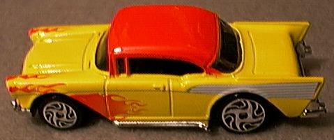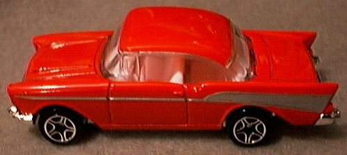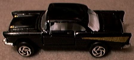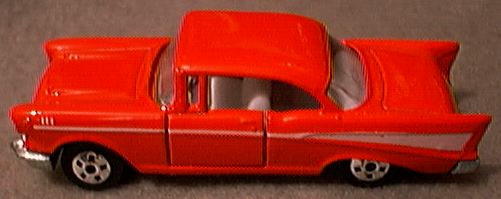 Road Champs issued both a 57 Convertible (top down) and HT with hinged doors about 1984. Summer issued a 57 HT about 10 years ago. This casting is a fairly crude representation. The side window vents are blanked out and the side chrome trim is incorrect. Valvoline issued a distorted casting of a 57 Convertible (top down) in their 'Most Wanted' promotional set in 1993. The major distortion is in the engine grille on this model.