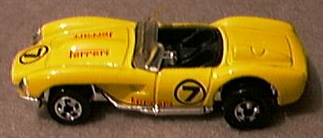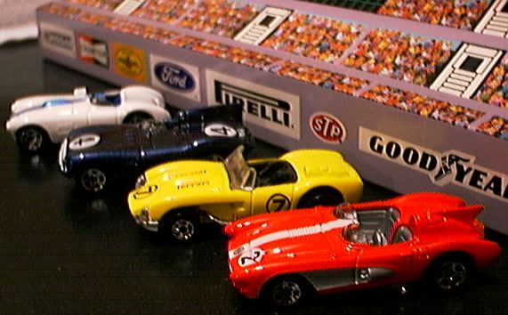 racing events. Several years back, a diecast company asked my advice on what models they should produce. As always, I was happy to suggest a variety of models not seen in small-scale. I also suggested that they seriously consider doing a vintage racing series. They were concerned that vintage racing was not what the consumer of toy cars wanted. I hate to say I told you so. Clearly Mattel and Hot Wheels have seen the success of vintage racing and made the most of it. Some of the most popular new Hot Wheels models of the past few years have been vintage racers. HW has produced vintage race cars from the earliest days of racing to the 1970's in their vintage racing offerings. Vintage racers of the 1950's are some of the best remembered of the racing sports cars. In the 1950's, many of the sports racers were simply 'tuned' street models and were often offered buy the factory with the same racing modifications, for street use. It was the age of gentleman racers. Hot Wheels has produced four of the best-loved vintage race cars of the 1950's. The first to be offered is one of the most beautiful sports racers ever produced, the Ferrari 250 Testarossa. The 250TR had great success on the track but HW has only done one version in racing livery. If you have never heard the V12 of a 250TR scream down the straight, you have missed the best automotive sound of all time. The second vintage racer of the 1950's from HW was the lovely Jaguar 'D' type. This time HW did it right by presenting the first edition of the car in the number and colors that won Le Mans in 1957. The 'D' type with it's disc brakes and DOHC six was and still is one of the all-time greats. In 2001, Hot Wheels introduced the Cunningham C4R. Not as well known as the Ferrari or Jaguar, the Cunningham was the work of enthusiast racer Briggs Cunningham. They were produced to win Le Mans but third was the best they ever did. A small number of street versions were made. Offered by HW in American racing colors, all that's missing are racing numbers. For 2002, the latest '50's vintage racer is out. The Corvette SR2 first raced at Sebring and then fell victim to GM's ban on factory supported racing. As a result it was never developed into a winning race car. Still, with it's twin racing windscreens and shark fin tail, the SR2 certainly looked the part. Again, HW did it in racing colors and remembered the number this time. Several other great sports racers of the 1950's need to be done to fill the grid for this sub-set. We need the Mercedes-Benz 300SLR, which Maisto already offers in larger scales. We also need the beautiful Aston Martin DBR1 that won Le Mans in 1959. Fangio's Maserati V8 sports-racer of 1957 is a must as well. Tomica does a nice sports-racer version of their Porsche 356 cabriolet and Maisto and Hongwell offer the Porsche 550 Spyder but none yet in racing colors. Johnny Lightning has the M.G.A. and Triumph TR3 but has not done racing versions. Hot Wheels have also produced some great vintage racers from the 1960's and as soon as I find the new Ferrari 330 P4, we will be seeing a review of these cars. |