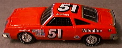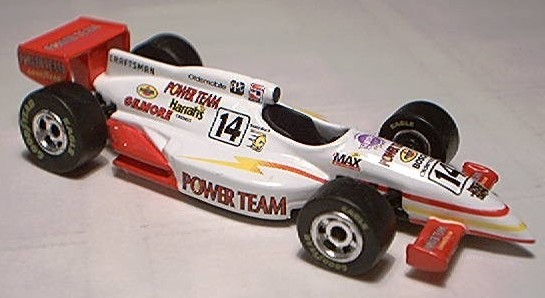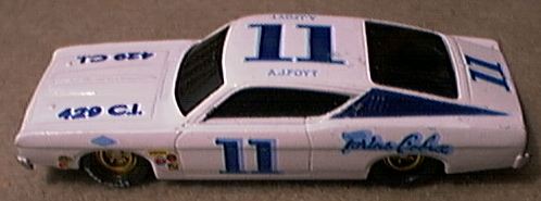 AJ also campaigned in stock cars, working both the USAC series (now dead and gone) and the better-known NASCAR circuit. His most important win was the 1972 Daytona 500. The Ford Torino Cobra like to the one pictured here by Racing Champions was A.J.'s ride in the early 1970's. By 1977, he was driving an Oldsmobile Cutlass like the one shown here by Johnny Lightning. Sports cars may have been only the spice on AJ's main course of racing but he did achieve one big international win as part of Ford's GT-40 effort, taking 1st at LeMans in 1967 partnered with the great Dan Gurney. Near the end of his driving career he also participated in some major team efforts to win the Daytona 24-Hrs in 1983 (Porsche 935) and 1985 (Porsche 962). Foyt continued to drive Indy cars well past his prime until finally the ravages of time and gravity prevented him from even qualifying at Indianapolis. He gave up this part of his career reluctantly but stays involved as a team owner in the IRL series. His car took Swede Kenny Breck to an Indy win in 1999. This winning car is pictured here by Johnny Lightning and is a real beauty, very realistic, including the sculpted ground-effects bottom. In addition to his Indy car team, Foyt also runs race teams in NASCAR Winston Cup and Busch Grand National, the latter team featuring driver and younger son Larry Foyt. A grandson, AJ IV is making is taking his first steps in sprint cars. |