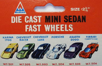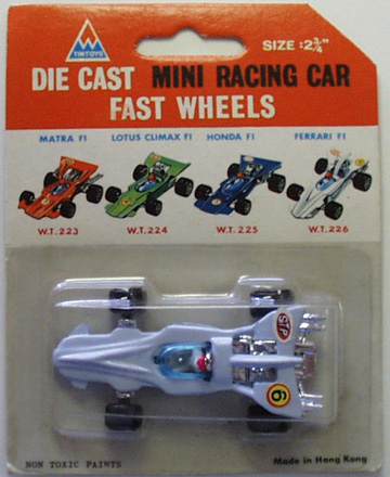 WT501 Matra Simca 670 Racer (T316) WT502 March 707 Can Am Racer (T315) WT503 McLaren M8A Can Am (T314) ![]() WT504 Porsche Audi Can Am (T313) WT505 Gulf Mirage Can Am (T312) WT506 Ligier J513 Racer (T311) WT507 Ferrari WT508 Ferrari 312P ![]() WT511 Ferrari 512M WT512 Howmet "TX" WT707 March Can Am (T315) WT710 McLaren M8A Can Am WT713 F1 Racer ![]() WT8101 Citroen CX WT8102 Fiat X 1/9 WT8227-8230 Coach Variations ![]() WT8307 Cadillac Seville ![]() WT8308 Toyota 2000 T219-224 Truck w/ Flatbed Variations T281 1904 Renault (larger scale) T285 Double-Deck Bus T286 Long Journey Bus T287 Tourist Bus T288 Private Touring Bus ? Refrigerator Truck (Pencil Sharpener) ? Mercedes Benz 450SL ? Toyota Celica |