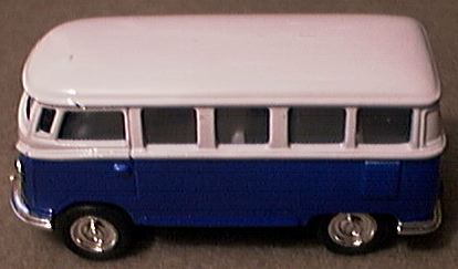 fairly extensive range liveries to coincide with actual German service vehicles. Great Britain Unquestionably the most prolific producer of Volkswagen Transporter and Bus models, British diecast companies continue to supply collectors with miniatures of this beloved vehicle to the present day. Among the first diecasters in the world to capture the Transporter in small scale, Matchbox has offered a wide ranging number of variants over the years. The very first Matchbox assigned the number of 34 was a Transporter Panel Van: like most early Matchbox miniatures, it was equipped at first with metal wheels and later switched to couple of different plastic types, yet, unusually for a Lesney model, appeared in only one color with 'Matchbox International Express' decals. This model was replaced in the lineup with a Kombi 'Camper' model that, again, was painted only one color yet was fitted window glazing, opening side doors, an interior and came with at least two different wheel types. This model was once more replaced with another casting that featured the now familiar extended, pop-top roof and again one color and a single wheel variation. After a couple of seasons, the casting was modified again to depict a lowered roof yet the wheels and color remained unchanged; this model lasted until the arrival of the new 'Superfast' models in 1969/70. By this time, Volkswagen itself had replaced the Split-window vehicles with the new Bay-window type; however, a model of this new VW Transporter, in Camper form, would not join the Matchbox range for another year. The fourth #23 in the 1-75 series was the Superfast-equipped Bay Window Volkswagen Camper that was initially supplied with a side-hinged, pop-top sleeper. After deletion from the premier Matchbox range, this miniature was lived on as a twin-pack, military ambulance offering that was striped of its interior, fitted with darkly tinted green window glazing and retooled with a solid, diecast roof sans the pop-top. Later still, this modified bus casting reappeared yet again as a 'limited edition' model wearing red and green Pizza Van tampos on a white body. Curiously, this model was resurrected in Hungary and was uniquely produced there with both the earlier pop-top and later 'Pizza Van' graphics of the former English miniatures. Matchboxís new owner, Hong Kong-based Universal continued the tradition of selling a rear-engined, Volkswagen transporter when it debuted a scale model of the third generation vehicle in an ambulance livery. Unfortunately for American collectors, this miniature was never included as a member of the North American 1-75 range and, consequently, can pose quite a challenge for collectors outside of Europe to locate. Finally, after Mattel's takeover of Tyco and its securing of rights to the Matchbox range and trade name, two more Split-widow Volkswagen transporters appeared: the brand's first Samba miniature and yet another Panel Van. Marketed as members of both the standard 1-75 lineup and a bewildering array of special and limited edition models, the Samba and Panel Van can be found in both plastic and rubber-tired versions and in restrained and tasteful colors as well as loud paint-schemes with gaudy graphics. Often viewed as Matchbox imitators and sometimes rivals, the Morestone range of Budgie miniatures included a well-proportioned Volkswagen Kombi. Invariably painted light blue, this simple yet effective model had no interior and consisted merely a body casting, a baseplate, two axles and four wheels. Despite its accuracy, all Budgie Kombis suffer from a decided ride-height problem caused by the manner in which the baseplate was attached to the body and the small wheels fitted to the model. The only non-British vehicle to appear within the 1:72 scale Dinky Dublo series was a miniature of the Volkswagen Split Window transporter. Bearing a striking resemblance to Matchboxís model of the same period, the Dublo miniature's construction differed in its use of a sheet metal, rather than diecast, baseplate. Only painted a yellowish orange with red Honby Dublo decals applied, this once relatively abundant model has steadily climbed in value and apparent rarity over the past decade and a half. Corgi first attempted to tackle Lesney head-on with its successful and highly varied Husky miniatures during the mid-1960s. Giving children and collectors a wide range of miniaturized British, American and European vehicles to select from, an early favorite was the Spit-window pickup that was offered as a low-side 'platform' truck from which politicians could give a speeches (#12), a high-side pickup with rear tilt for general transport duties (#15) and finally a low-side, airport ramp vehicle with a rubber conveyor belt that extended over the cab and carried luggage into the bellies of awaiting aircraft (#32). Growing increasingly rare on today's antique toy market, it is important to watch for two faults that afflict all and one variants of this model to varying degrees: the chrome-plated, plastic bases have a tendency to 'flake' and the rubber conveyor belt on the ramp truck often dry-rots and becomes brittle with age. Perhaps the most intricate miniature of the Volkswagen Samba, Lone Star initially unveiled this model in their over-the-top Impy series. As was typical in this range of models, early versions of the Samba was equipped with operating directional steering, jeweled headlamps, a two-piece wheel and tire combination, and an opening rear hatch, engine cover and side doors. In response to Mattel's Hot Wheels and Lesney's Superfast miniatures, Lone Star fitted new frictionless wheels throughout its Impy lineup, renamed the series Flyers and deleted many of the functional gimmicks. Interestingly, the earlier Impy castings were sold in both civilian and police versions.