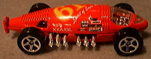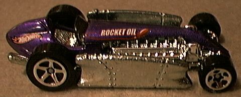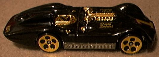 | Turbolence "Dayla Special" A world record speed car like Sir Malcolm Campbell's Bluebird models With it's V12 aircraft engine, this sleek racer can only be a model for attempting new speed records. While the shape of this model is not the same as the Bluebird of Sir Malcolm Campbell, they shares V12 aircraft power. The 'Dayla Special' and 'Turbolence' names seem to be pure invention from Hot Wheels. This model would have to be in much smaller scale than the others featured here, perhaps 1:72 scale. The wheels are still to wide but hidden under the body, they are not as distracting. |