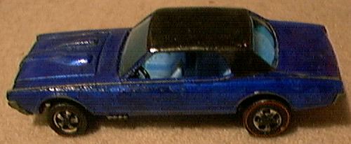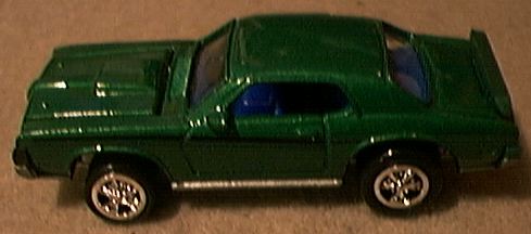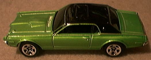 | Hot Wheels entered the small scale diecast market in 1968. One of their first models was the 1967 Custom Cougar Hardtop # 6205 with a hinged hood. This was followed by a modified casting in 1970. The engine hood was absent and the car was named the Nitty Gritty Kitty as a 1968 model # 6405. A remake and modification of this model was issued in 1998 in the Collectible 30th Anniversary Set. In 2002 a new casting of the 1967 Hardtop was issued as a First Edition # 17 model # 52935 and is still available. | ![]() 1967 Custom Cougar Hardtop #6205 |