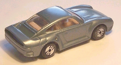 | The Porsche 959 has a lovely blue-gray paint, very similar to the real thing. It is not highly decorated- in fact there are no tampo graphics on it at all. This in itself is unusual for a Hot Wheels car. The paint does not have the deep shine most Hot Wheels cars have either. While both these are good hints it's a repaint, it is the condition of the wheels that clinches it. While there's not a trace of playwear on the paint work, the wheels have noticeable wear on the chromed surfaces. |