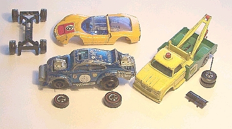 | Some wheels can be swapped about with careful work, leaving little or no sign. Early Hot Wheels redlines can be popped on and off easily ( both type 1 wheels with the little white plastic bearings, and type 2 with the black plastic backing-plate), and many early Matchbox Superfasts had their wheels held on by black bracket clips. Corgi Rockets, with their removable black chassis, are also very susceptible to wheel swapping.