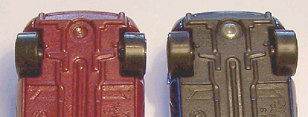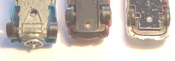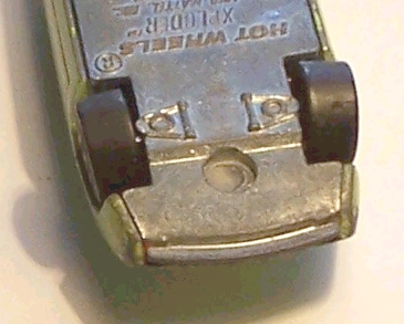| For other models, it is possible to swap wheels about- either by opening the car up, or by grinding the end off an axle. Look for signs of tampering, tool marks or glue. Also look to see if the wheels line up perfectly from left to right- one wheel swapping technique is to glue each wheel in separately on a half-axle. Amateur wheel-swapping using this technique will often result in a bit of glue sticking a wheel in solid, so check to see if they all still spin. |