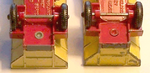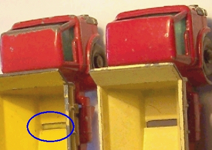 Two Ford grit spreader trucks- these are a common casting, but is one a variation? Paint shades on these two are very different, so are there any clues to either having been messed about with? The paint shading is consistent across the trucks, so it is unlikely to be fading from too much sun. The rivets look fine, but there's a couple of bits of over painting on one that gives the game away. The rivet end is the same colour as the base, when it should be bare or have traces of the yellow paint. Also, inside the bin the gray plastic chute gate is painted yellow- in fact the paint has glued the slide shut. There are a few bits of red paint on the side of the yellow bin as well.