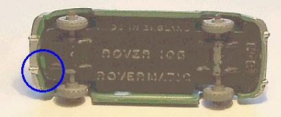 | Paint in odd spots If the rivets look intact but you suspect its been repainted, a good clue is to find a bit of paint in a spot where it shouldn't be. Many castings are intricate and even a practiced brush painter can't always avoid getting paint on the wrong bit. The Budgie Rover 105 below was sold to me as a repainted car. I had done the research and knew the Rover came in this shade of green, so when it turned up in the post I looked long and hard for the signs to tell me it wasn't original- one tiny bit of over painting confirmed it. It is also worth looking in the hard-to-reach spots for signs of an earlier paint colour underneath the paint. Under wheel wells, inside engine bays or up underneath the roof- any little cranny that might be missed by a later coat of paint. Keep in mind that sometimes a car may have originally had two layers of paint, such as a base coat and topcoat for a candy-apple effect, common through the seventies and eighties. Other models are known to have been repainted from the factory, such as the early Matchbox XK140 coupe, where some red versions had white paint underneath. |