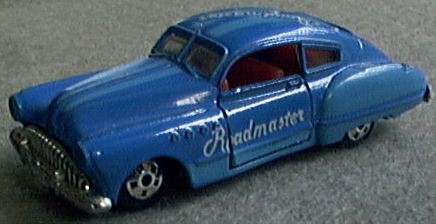 DESCRIPTION Road Champs of Harrison, NJ has produced many small-scale diecast. While clearly intended as toys, the older Road Champs are often well cast and represent cars not done by other manufacturers. The 1948 Buick Roadmaster is a case in point. Buicks have received little attention from diecast producers. The Roadmaster of the late 1940's is an unexpected addition to small-scale diecast. It came in black with flames and two-tone blue, with opening doors. With few manufacturers producing any Buicks, this is Road Champs second (see 1983 Riviera). Perhaps someone at Road Champs was a Buick fan. | |